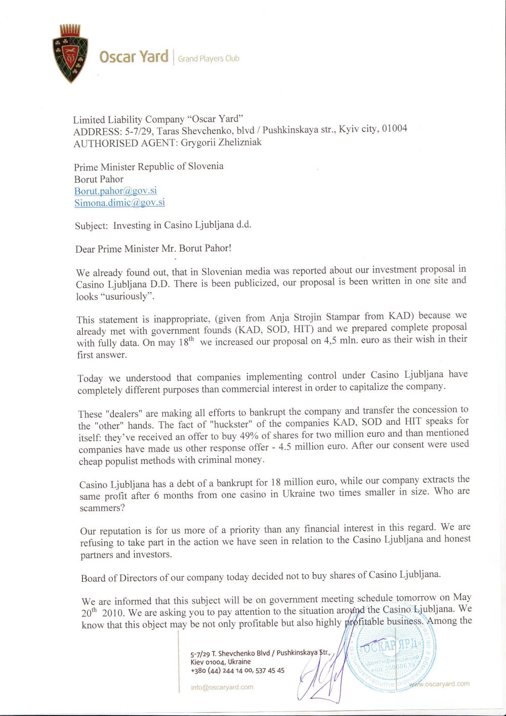 Ogorčeno pismo vodstva rusko-ukrajinske družbe Oscar Yard, ki so ga v sredo zvečer poslali predsedniku vlade Borutu Pahorju.