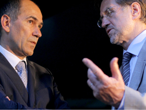 Janša in Peterle zamišljena v Jazz klubu Gajo.
