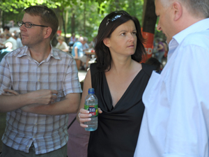 Evropska poslanka in bivša televizijska Tanja Fajon (levo Uroš Jaušovec, desno Andrej Horvat) se je pritoževala nad vročino in svojim avtomobilom, ker nima klime, je pa prišla v dokaj globokem dekolteju.