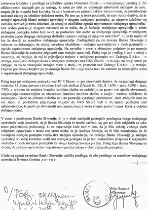 Faksimile dela dopisa Mitje Gasparija okrožnemu sodišču v Ljubljani (10. avgusta 2006), kot odgovor na predlog upnikov Sicure za razrešitev stečanjega upravitelja, ki nesporno dokazuje, kako je Gaspari do zadnjega konca ščitil odvetnika Goršeta.