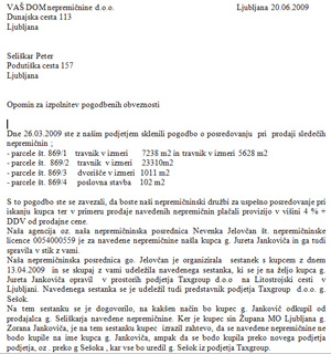 Faksimile pisma nepremičninske posrednice Nevenke Jelovčan prodajalcu parcel Petru Seliškarju (junija 2009) ...