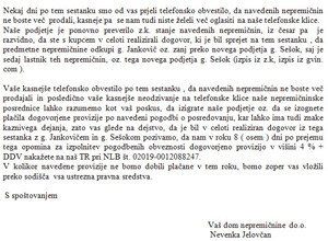 ... kjer navaja potek prodaje parcel, terja provizijo za posel in grozi s tožbo.