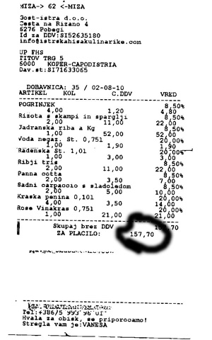 Faksimile računa, izdanega v Istrski hiši kulinarike.