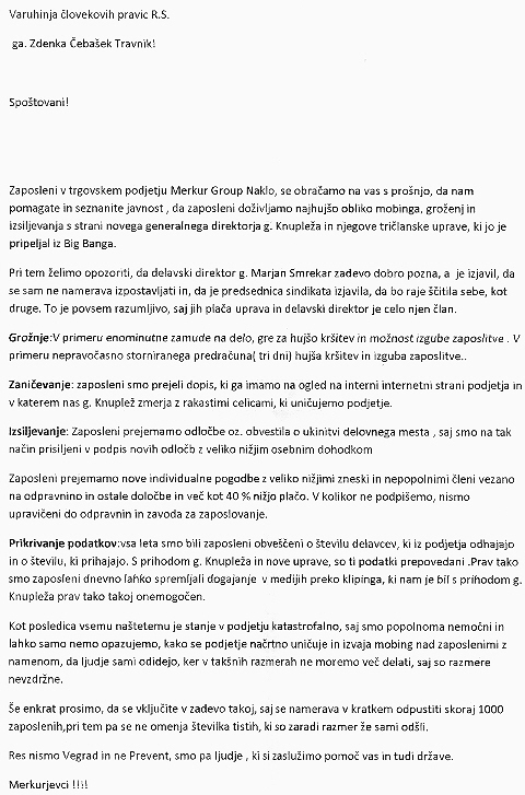 ... faksimile pisma Merkujevcev, ki so ga poslali varuhinji človekovih pravic Zdenki Čebašek Travnik.