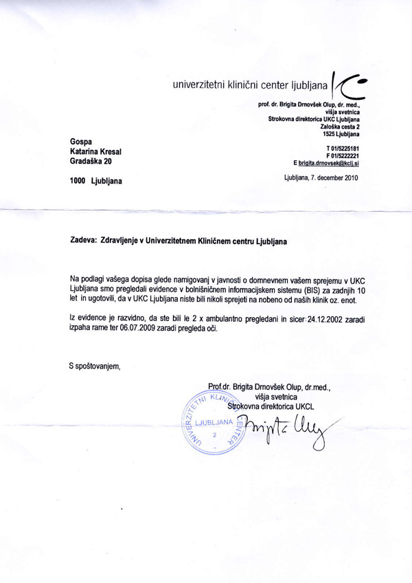 Faksimile potrdila Klinilčnega centra, izdanega ministrici za notranje zadeve (za povečavo klini na sliko).