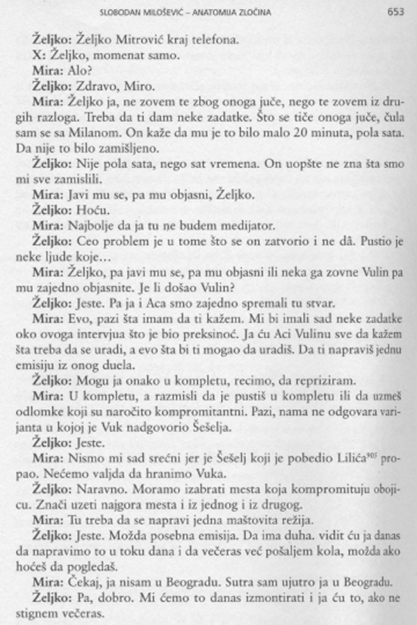 ... kjer Mira naroča oddajo, ki naj bi kompromitirala predsedniška kandidata Vojislava Šešlja in Vuka Draškovića, z opombo, da ji ne odgovarja varianta, kjer je Vuk bil boljši od Šešlja …