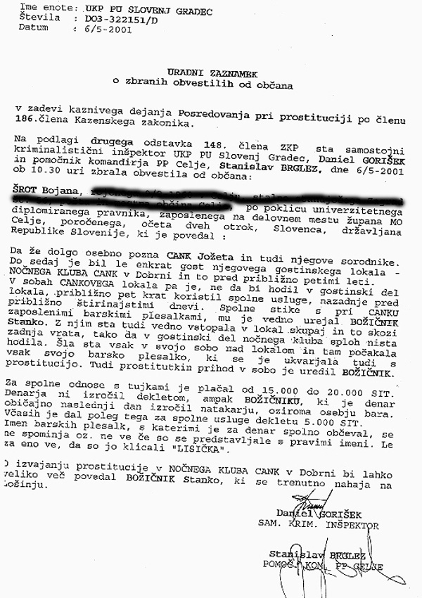 Faksimile uradnega zaznamka pogovora kriminalistov z Bojanom Šrotom (za povečavo klikni na sliko).