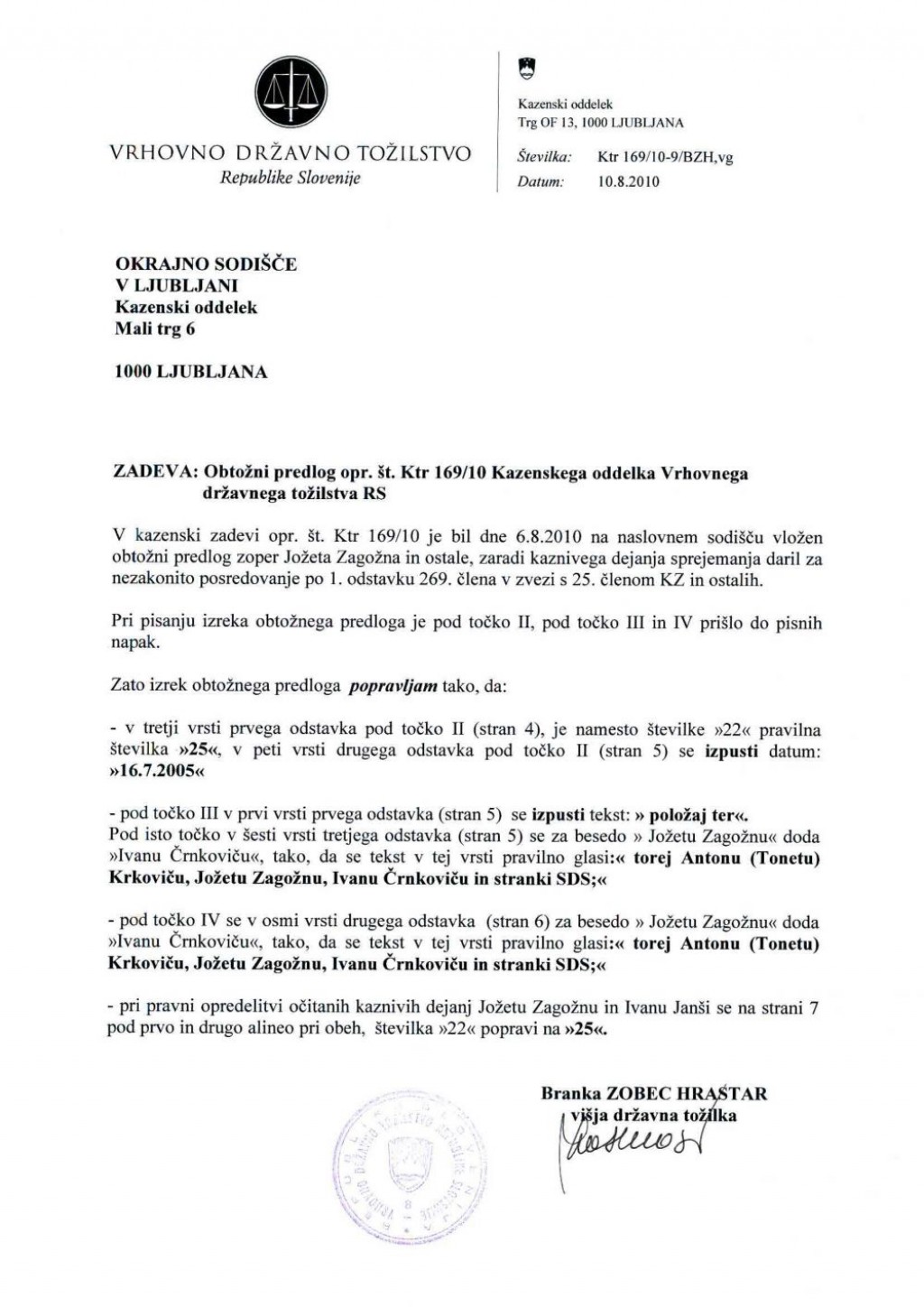 Faksimile: popravki obtožnega predloga vrhovne državne tožilke Branke Zobec Hrastar (za povečavo klikni na sliko).