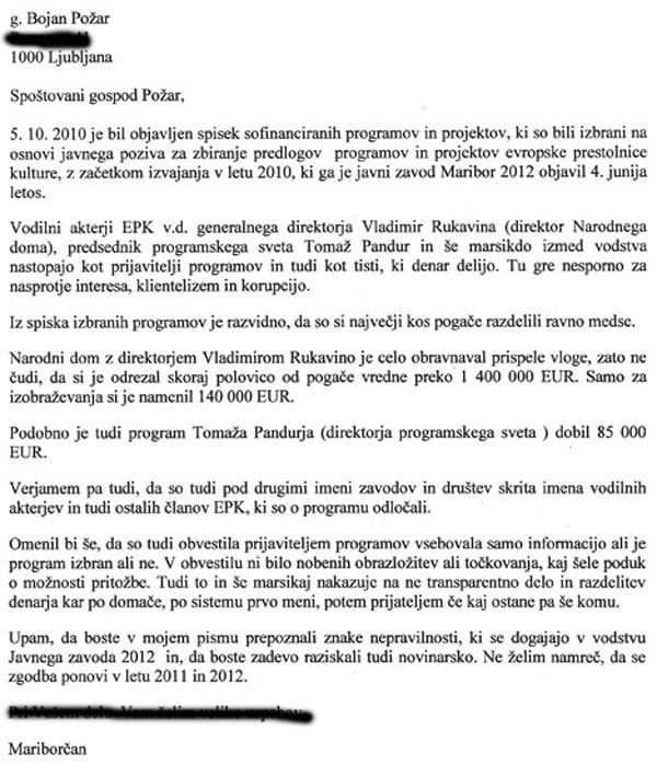 Čuuj ti Požar, ka ti nisn že reko enkrat, da mi več nea vlačiš mariborčane po totem tvojem električnem cajtengi. Čuuj me dobro ti zdaj. Marriborr bo prestolnica Soul glazbe in jas samo za to še živim. Lent bomo prodrli pa naredli eno vejko halo za črnsko glazbo tak ka bo zvok po Dravi plavo. Mi mariborčani moramo vkup držati, te smo močni pa te lahko zrihtamo evropska sredstva. Si mi že miniro olimpijske igre podn Pohorja. Jas te bom bujo, rečem ti, nea nas jebi. Idi trajbat Jankoviča če vupleš. Resna mislim. Čreve na plot.