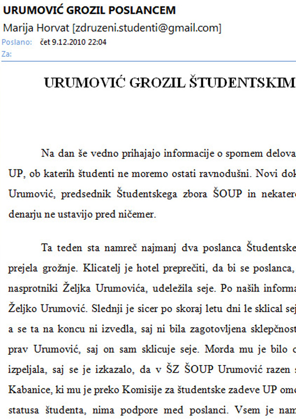 Kje pa so kakšni dokazi, da je ta tip grozil komu? V tekstu uvodoma pišejo anonimci o dokazih, da si želijo denar, kasneje pa o temu nič. Sprašujem, zato ker dobro poznam stanje v šoup in kako že 10 let tam preusmerja denar Sebastjan Kokl, ki je direktor študentske organizacije in predsednik koprskih SD, ki dobesedno onemogoči vsakemu, da bi se približal delovanju organizacije. Anonimci pa o njemu nič ne pišejo, čeprav je bilo že pred kratkim na televiziji dokazano, da je študentska organizacija, kjer je razpredena SD v bankrotu in polna dolgov, medtem ko se Kokl na veliko preserava. A si ti Požar sploh preveril kakšno navedbo v tej anonimki?